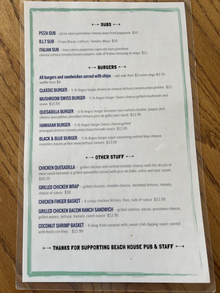 The menu at Beach House Pub focuses on comfort food with a twist. It features a range of categories, ensuring there’s something for everyone. Popular items include subs, pizza, and classic pub favorites like wings and fish & chips.